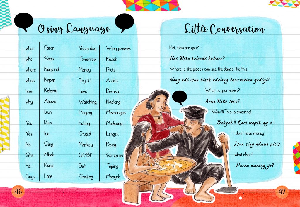 Seperti etnis lain yang dapat ditemukan di Indonesia, masing-masing dari mereka memiliki bahasanya sendiri. Itu juga berlaku untuk etnis Osing. Orang Osing masih menggunakan Bahasa Osing dalam aktivitas kehidupan sehari-hari mereka dan bahasa tersebut berasal dari Bahasa Jawa kuno. Jika Anda berpikir Bahasa Osing sederhana, Anda salah. Ada dua kelas dalam cara bahasa tersebut diucapkan. Kelas pertama disebut Bahasa Osing biasa. Dan kelas kedua disebut goko-krama. Osing biasa digunakan antara dua orang atau lebih yang berusia sama. Atau dapat juga digunakan oleh orang yang lebih tua terhadap yang lebih muda. Sementara itu, dalam kasus goko-krama, itu digunakan sebagai semacam kehormatan. Itu diucapkan oleh orang yang lebih muda kepada yang lebih tua untuk memberikan rasa hormat. Hampir tidak ada perbedaan tata bahasa antara kedua kelas tersebut tetapi mereka menggunakan diksi atau pilihan kata yang berbeda. Misalnya, kata "bengai" (yang berarti "malam") sebenarnya adalah bagian dari Bahasa Osing biasa. Namun dalam kelas goko-krama, kata tersebut berubah menjadi "ndalu". Jika Anda adalah orang yang lebih muda dan Anda mengatakan "bengai" kepada orang yang lebih tua, Anda akan dianggap sebagai orang yang kasar. Begitulah Bahasa Osing digunakan oleh masyarakat. Hal unik lainnya tentang Bahasa Osing terkait dengan bagaimana ia diucapkan (masalah fonologis). Seperti yang telah disebutkan sebelumnya, Bahasa Osing berasal dari Bahasa Jawa kuno. Dan dalam Bahasa Jawa, pada dasarnya kata untuk "malam" adalah "bengi". Meskipun demikian, dalam masyarakat Osing, bunyi "i" diubah menjadi diftong "ai" dan itu menciptakan "bengai". Transformasi semacam itu dalam Bahasa Osing sering terjadi dari berbagai kata Jawa terutama yang memiliki bunyi "i" sebagai bunyi terakhir.